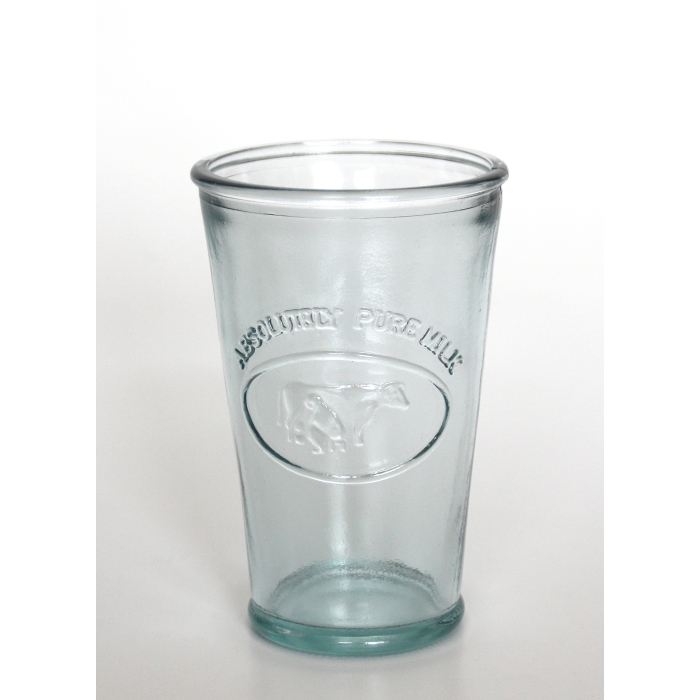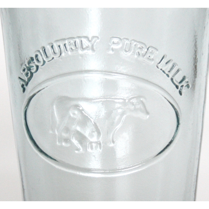 Milchglas mit Kuh- bzw. Melk-Motiv (Relief) und Aufschrift "Absolutely Pure Milk".